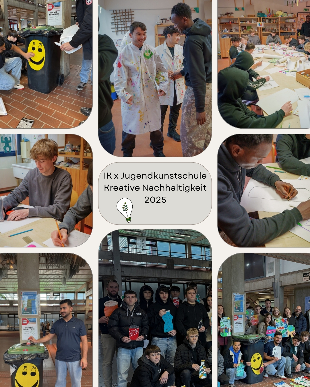 Nun haben die internationalen Klassen die Tonnen bunt gestaltet. Unter der professionellen und kreativen Anleitung der Jugendkunstschule wurde jeder am Ende des Tages selbst zum Maler und Künstler. Jede Klasse hat an einem Tag Bilder auf selbstklebendem Leinwandpapier gemalt – Flaschen, Symbole und motivierende Sprüche sind auf den Bildern zu sehen.